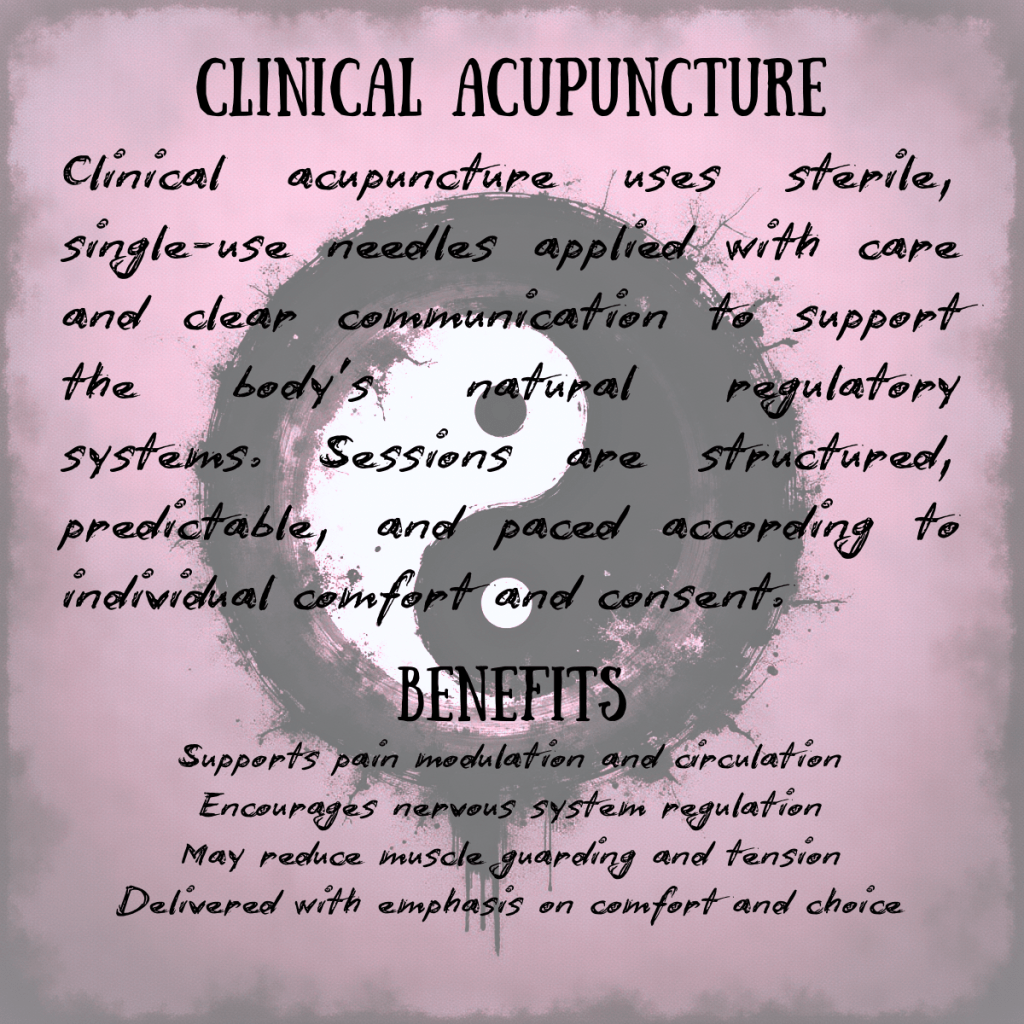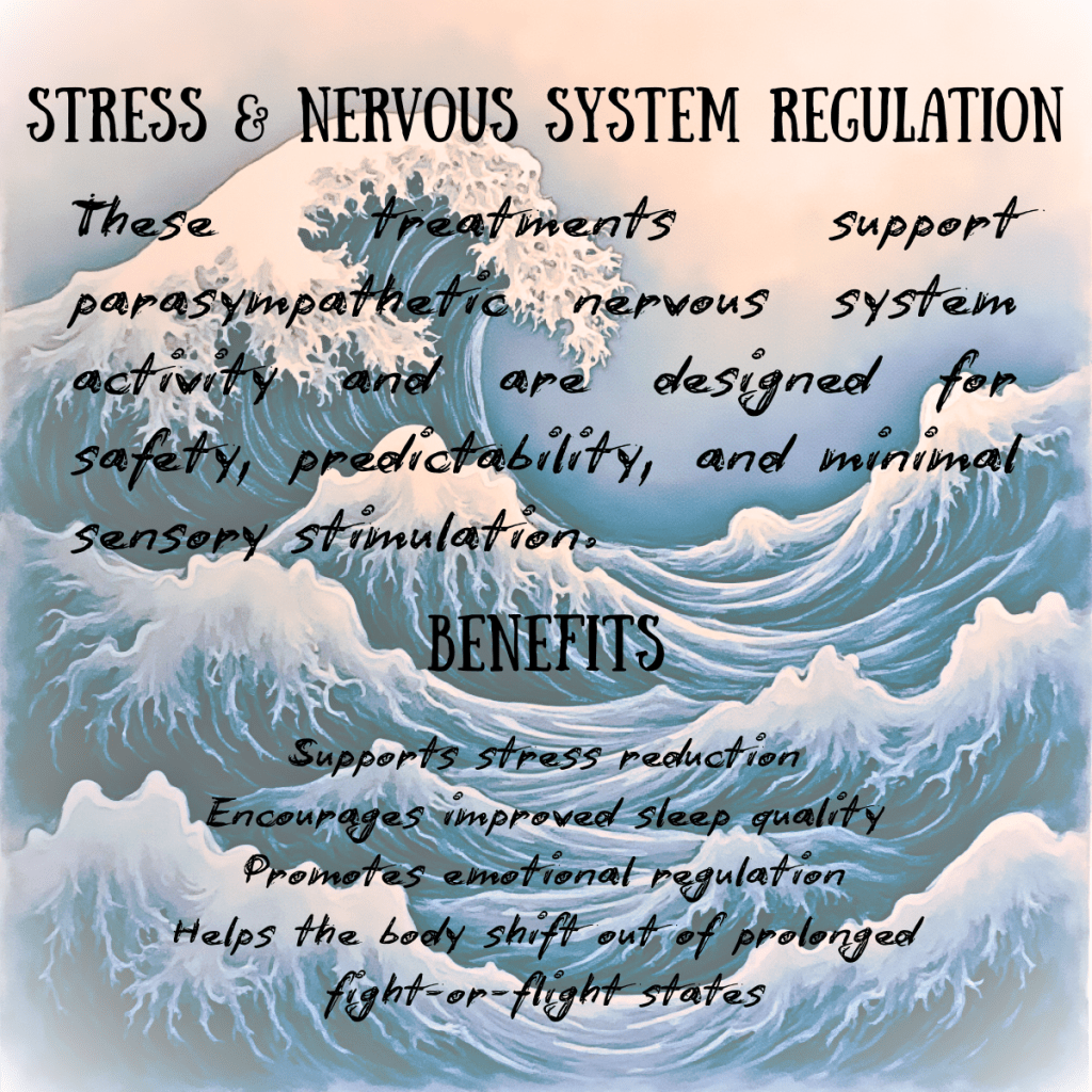 Each person’s care is individualized. The modalities below are tools we may use to support regulation, comfort, and functional improvement. Treatment choices are discussed in advance, guided by assessment, consent, and what feels appropriate for your body.